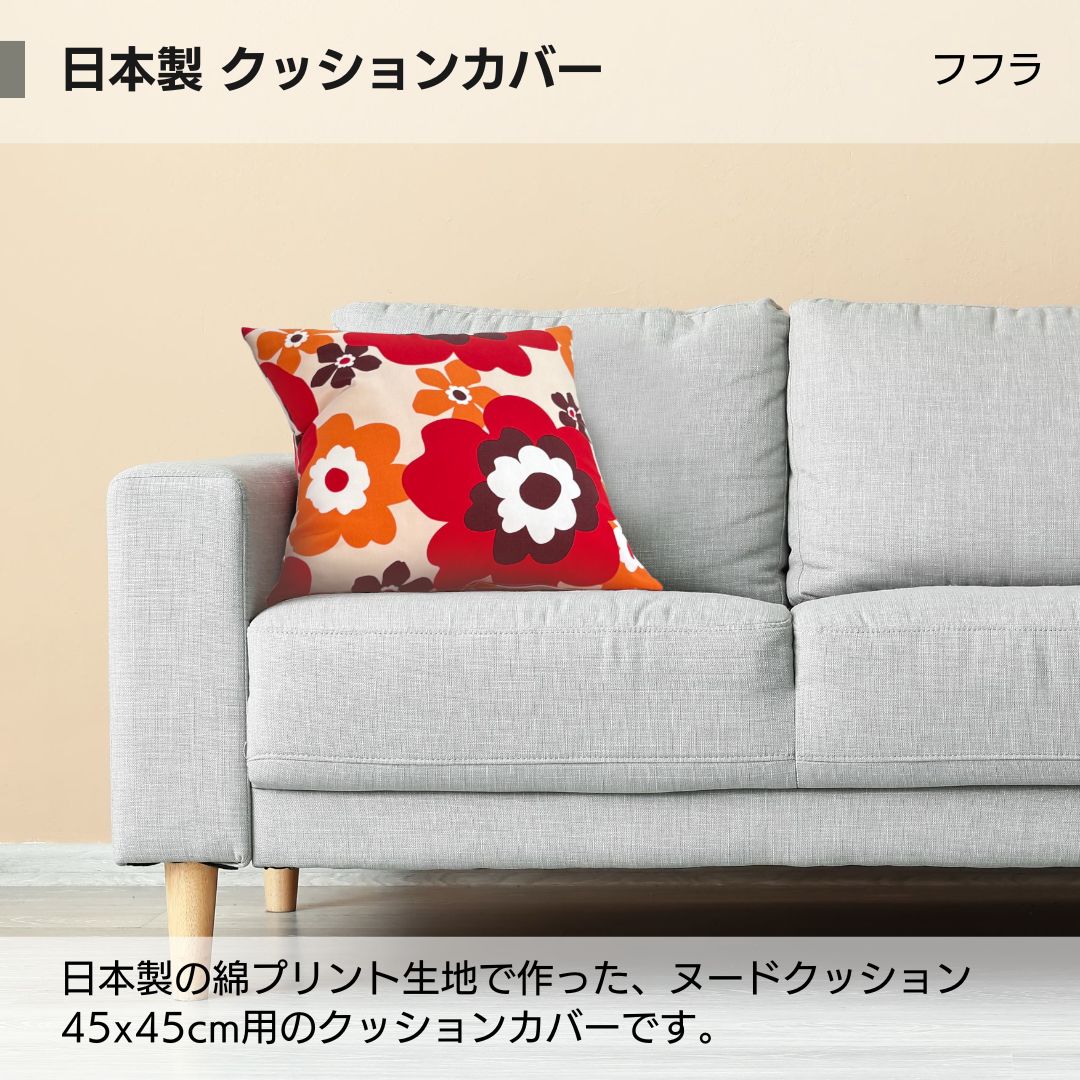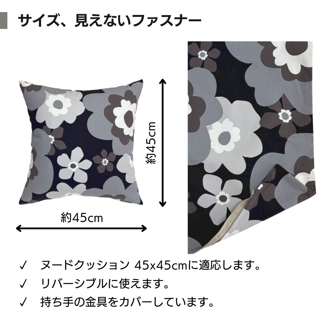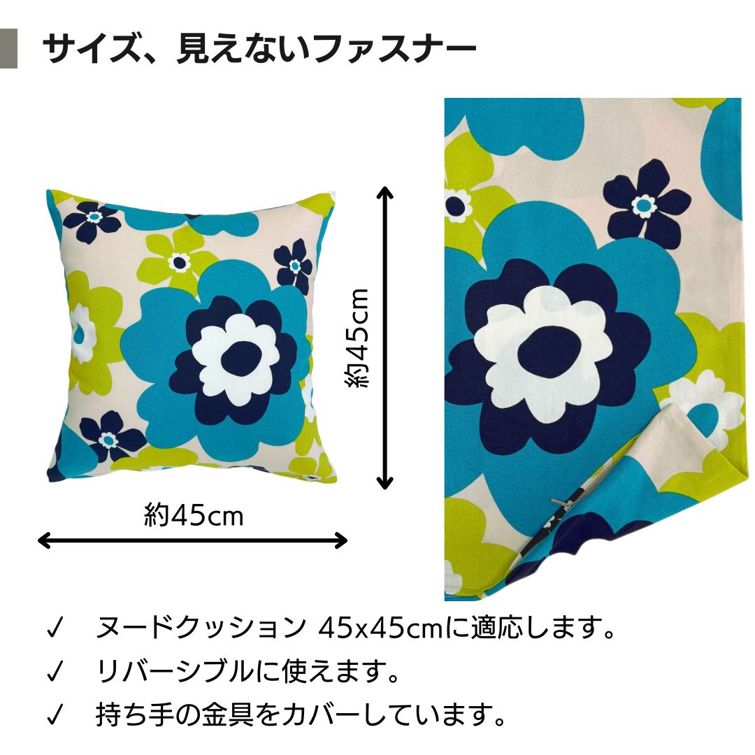 日本製の綿プリント生地で作った、ヌードクッション45x45cm用のクッションカバーです。