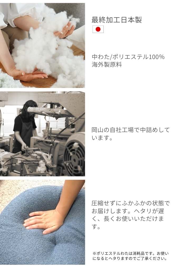 この製品は、中国の自社工場で縫製、綿の中詰めは岡山の自社工場で仕上げています。