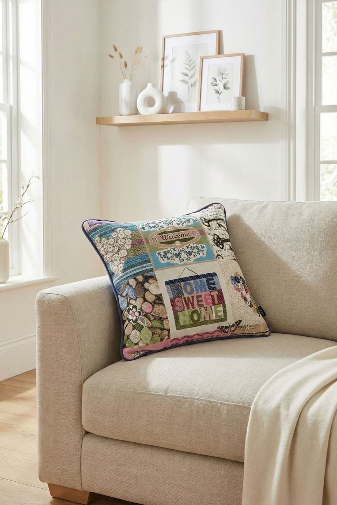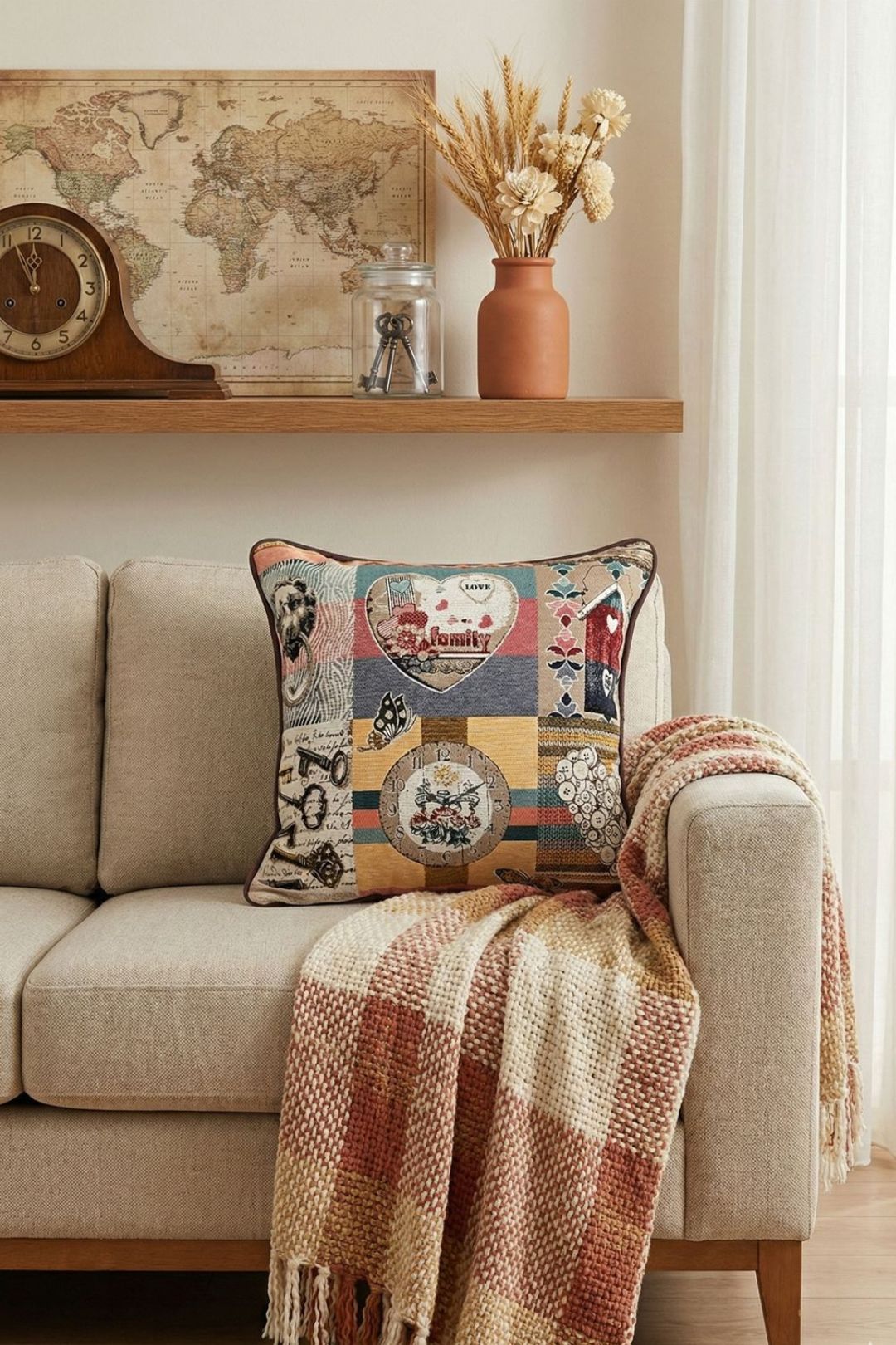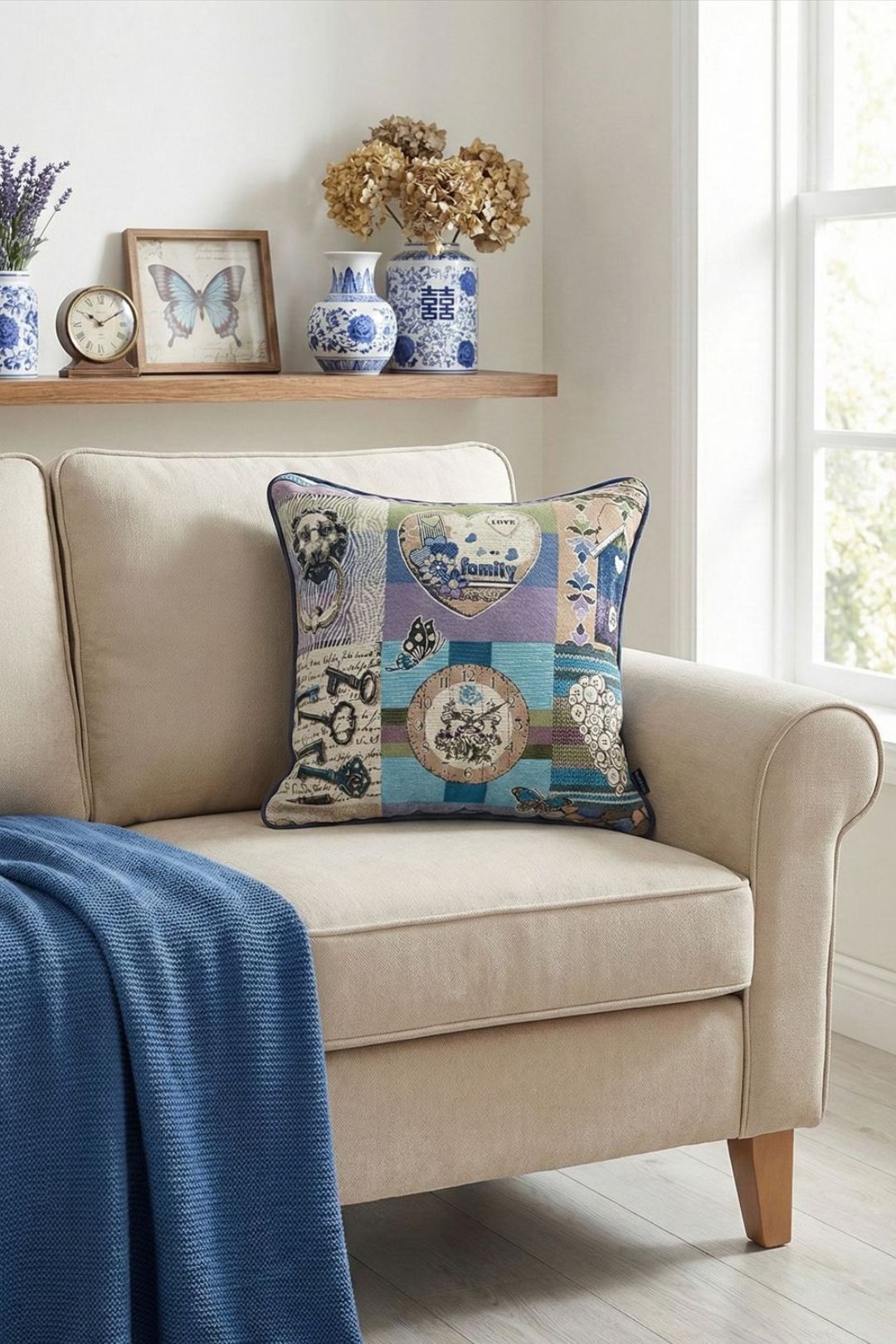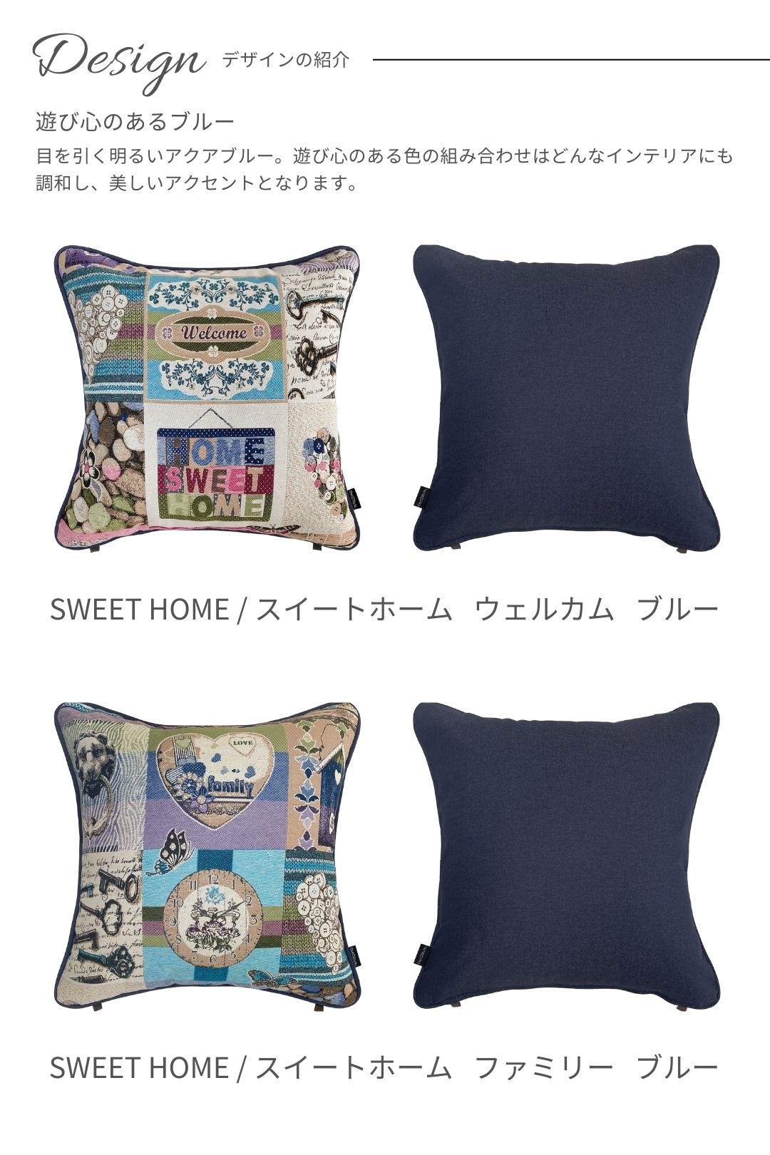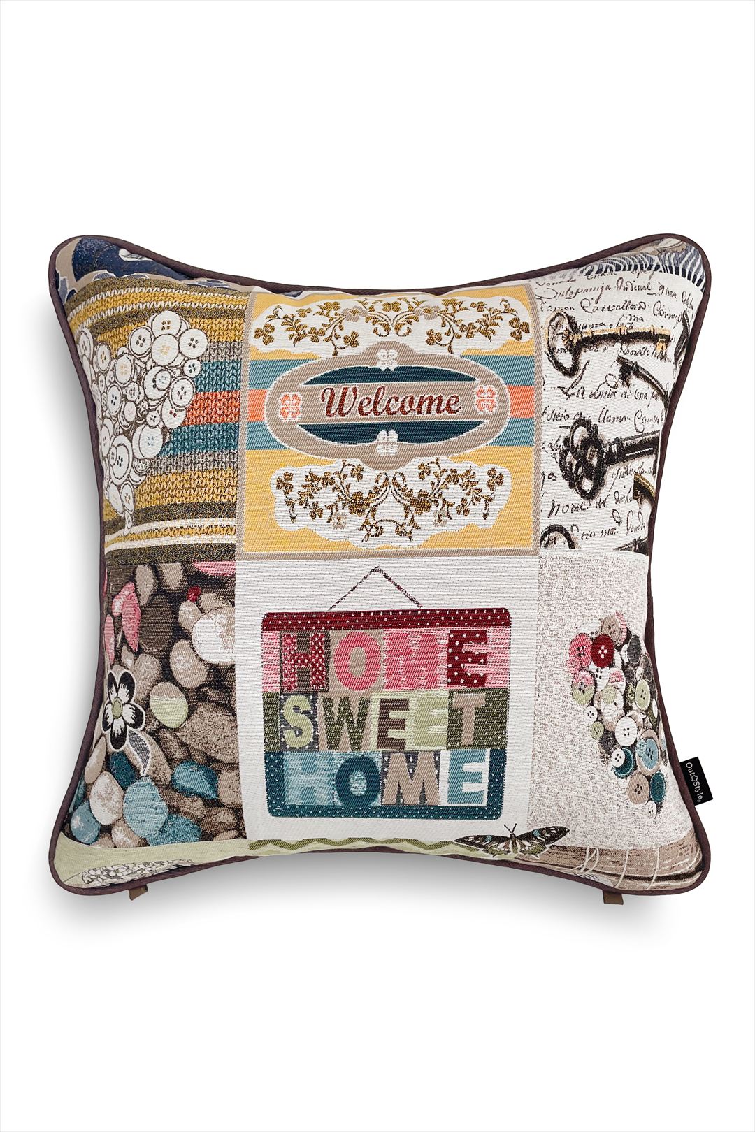 ゴブラン織を使用したクッションカバー。時計、鳥小屋、ボタンなどのモチーフが織り込まれ、心温まるアットホームな雰囲気を演出します。