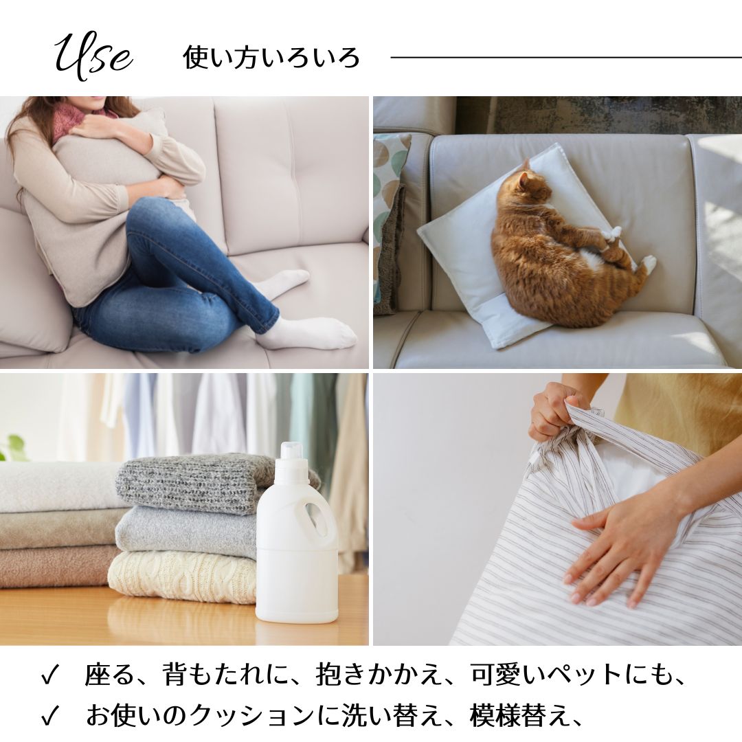 お使いのクッションカバーに、新しい洗えるヌードクッションを入れれば、繰り返し洗って長くお使いいただけます。