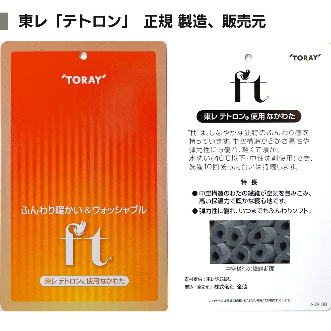 中材/ポリエステル100% ポリエステルわたは、国内メーカーの東レ「テトロン」を使用しています。商品には、原料メーカー認定の製造者(株式会社金鵄)を印字した「ftラベル」を付けています。