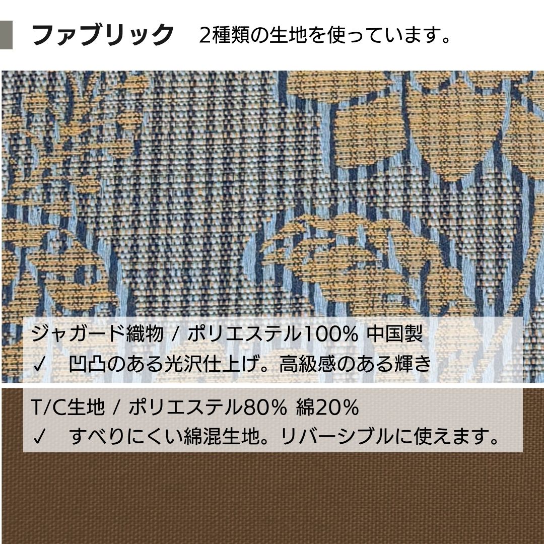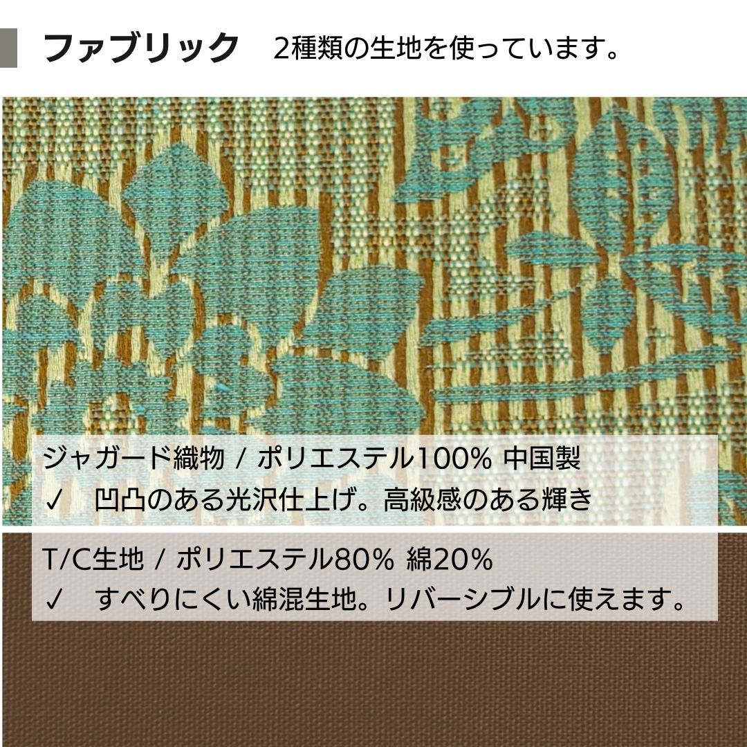 裏面(無地): ポリエステル80%・綿20%の混紡生地。綿が含まれているため、椅子に敷いたときに滑りにくいのが特徴です。 落ち着いた無地の面を表にしてもご使用いただける、お得なリバーシブル仕様です。