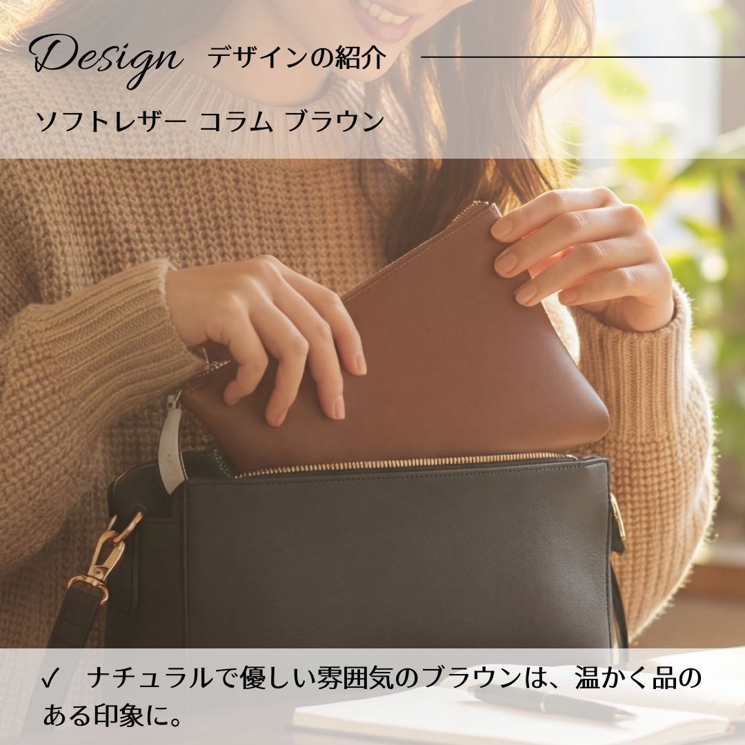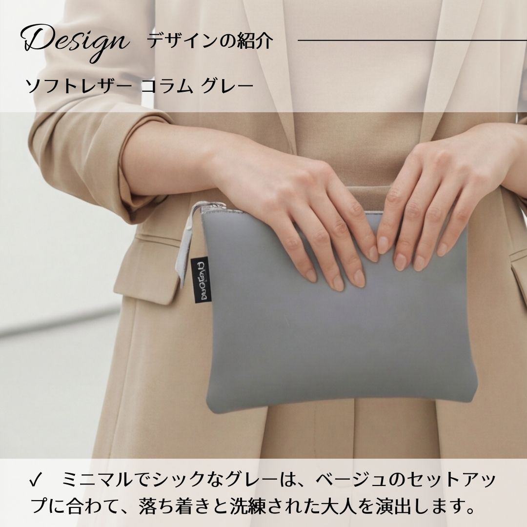 ■ 汚れに強い、上質なソフトレザー(PVC) メイン素材には、インテリアにも使われる高品質なPVC合成皮革(ソフトレザー)を使用。本革のようなしっとりとした手触りと高級感がありながら、水や汚れに強く、サッと拭き取れるのが特徴です。メイクポーチやガジェットケースとしても気兼ねなくお使いいただけます。