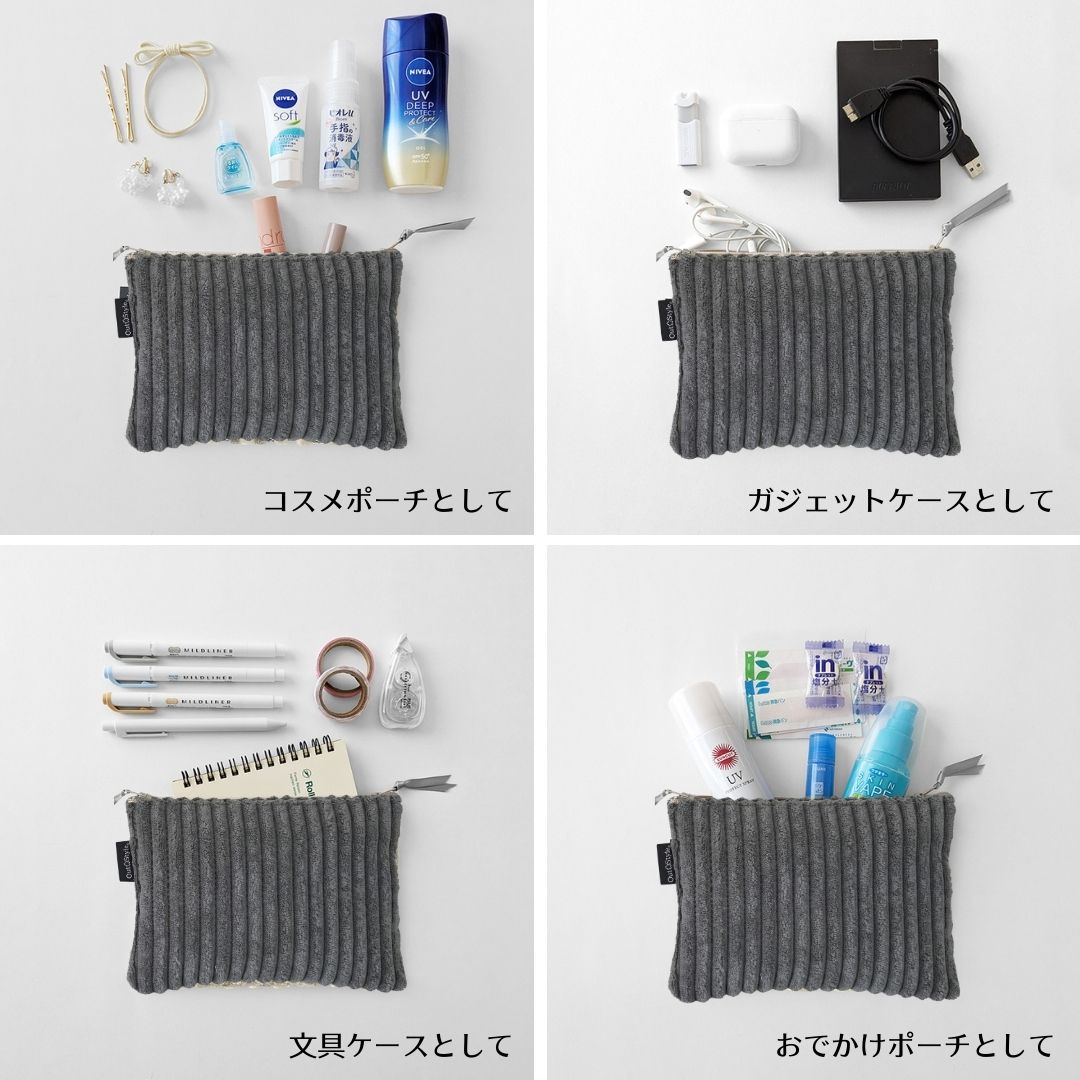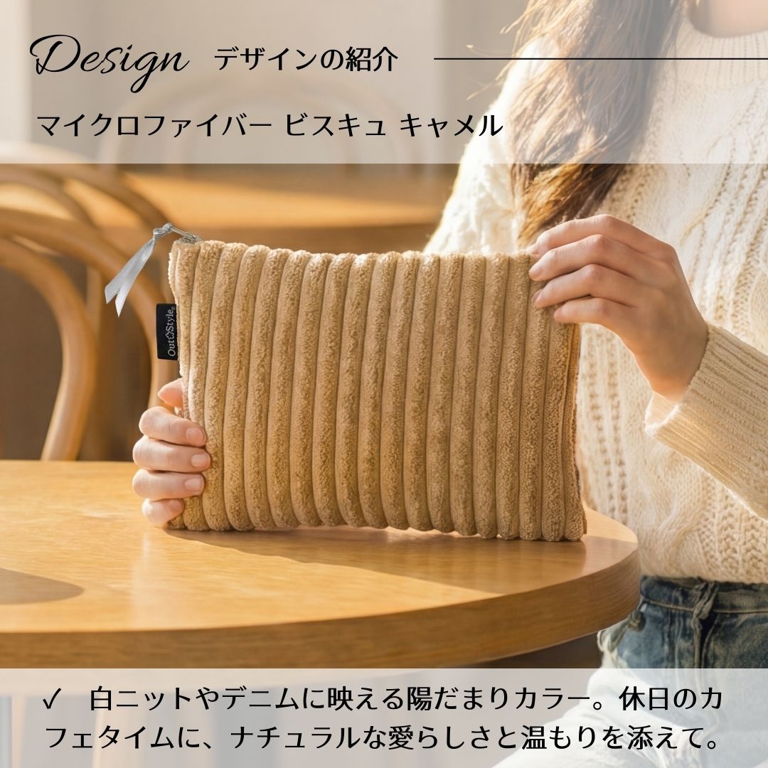 秋冬の装いに、やさしい温かみを添えるアイテムが届きました。 老舗クッションメーカーが手掛ける、触れるたびに癒されるコーデュロイ調ポーチ。 素材へのこだわりと、地球への思いやりが詰まった一品です。