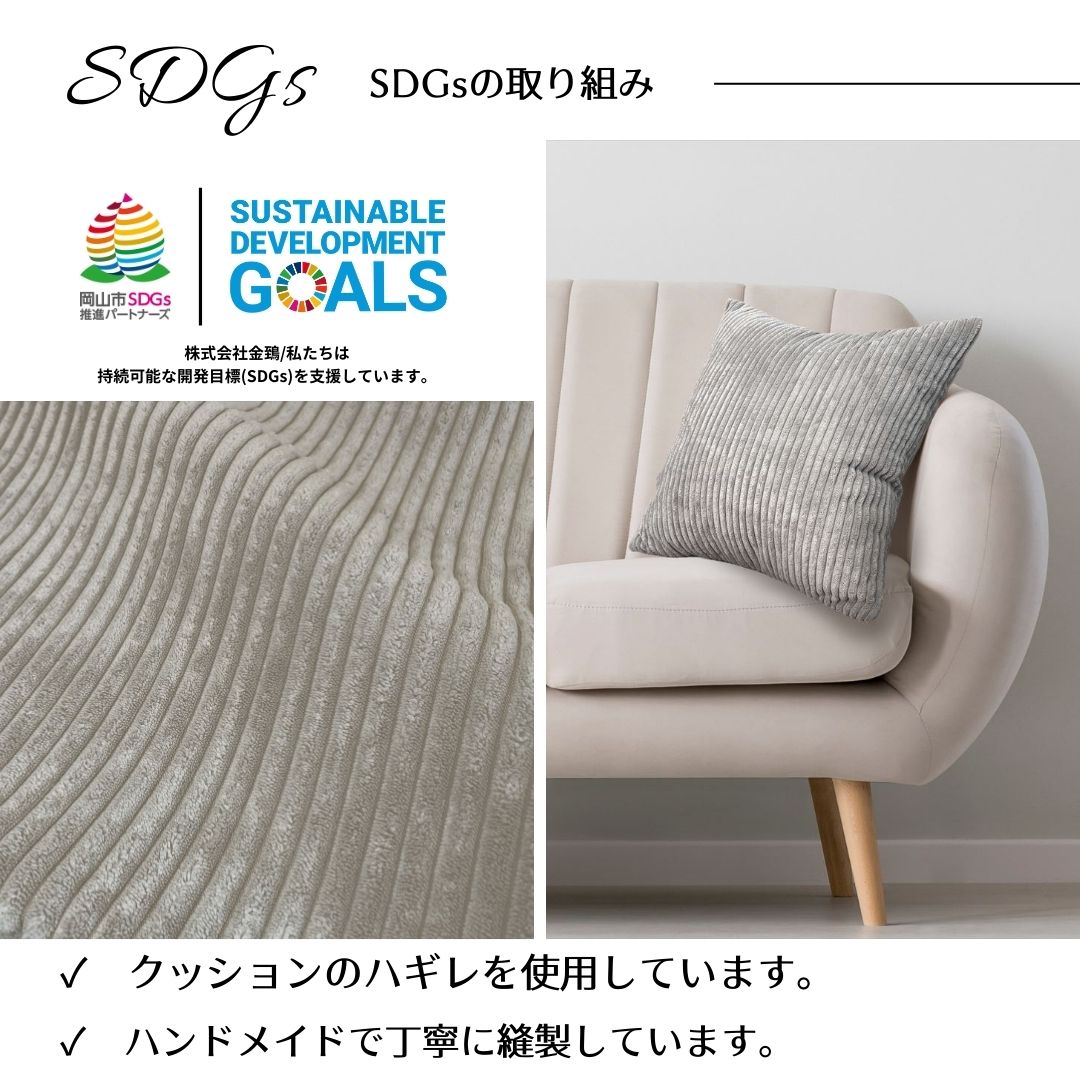 「ビスキュ ポーチ」は、老舗クッションメーカー「金鵄(きんし)」のサステナブルな取り組みから生まれました。 中国工場で縫製されたクッションは、日本国内で厳しい検品が行われます。その過程で、小さなキズや汚れのために惜しくも規格外となってしまったクッションたち。 それらを廃棄するのではなく、まだ使えるきれいな生地部分を丁寧に裁断し、新たな命を吹き込んでポーチとして蘇らせました。 使う人にも、地球にもやさしい、アップサイクルなアイテムです。