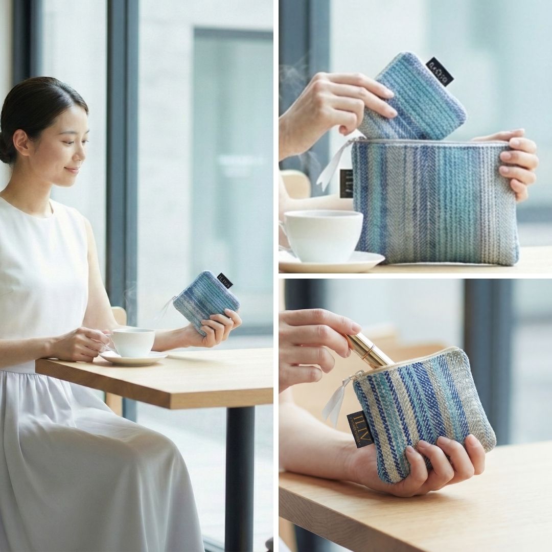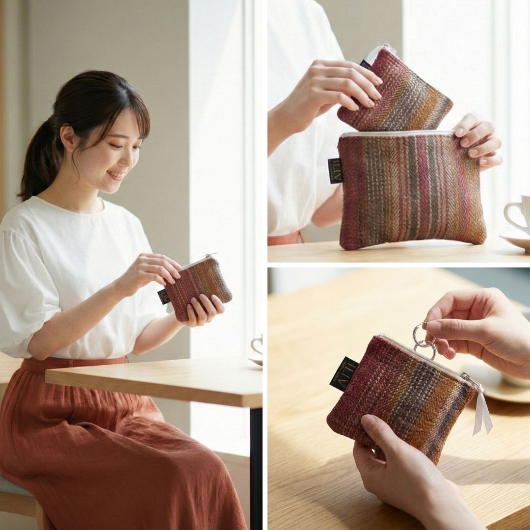 Scene: エシカルなライフスタイルを楽しむ日常 週末のマーケットで買ったこだわりのコーヒーを片手に。上質な生地が持つ「歴史」と、廃棄を減らす「未来」への想いが詰まったポーチを携えて、心地よい一日を過ごす。