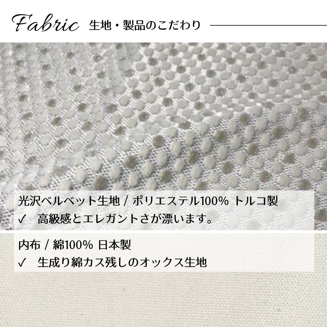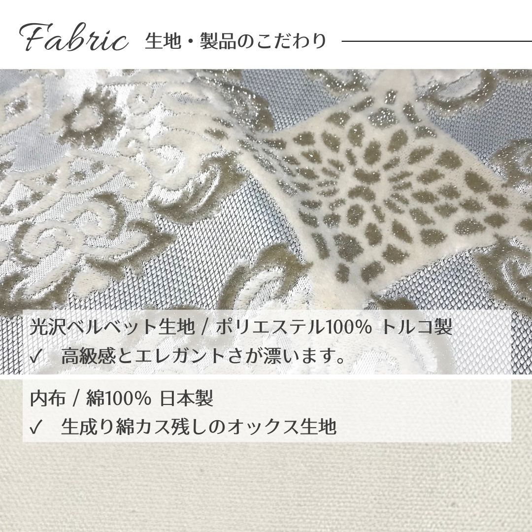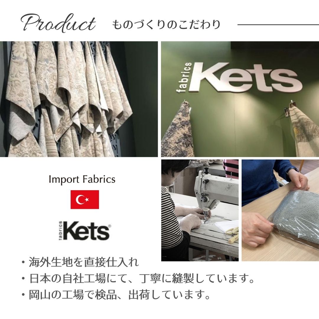 世界的なテキスタイルメーカーであるトルコ「KETS」社の生地を使用。起毛の柔らかさと上品な手触り、そして美しい模様の中にはキラキラとしたラメがちりばめられており、日常に贅沢な彩りを添えます。