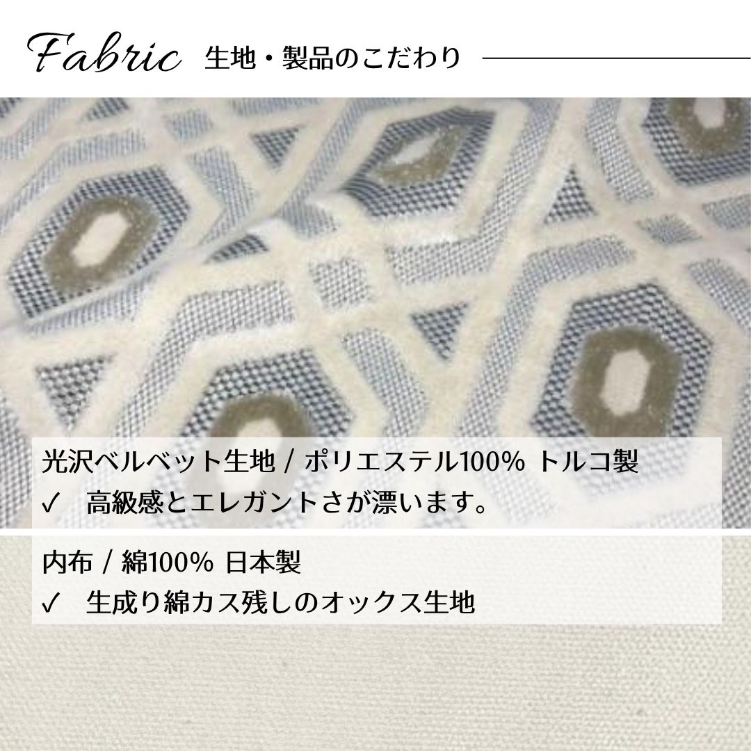 トルコのモスクを彷彿とさせる、神秘的でエキゾチックな伝統文様。緻密なベルベットジャガードで表現された繊細な柄は、インポート生地ならではの芸術的な美しさを楽しめます。