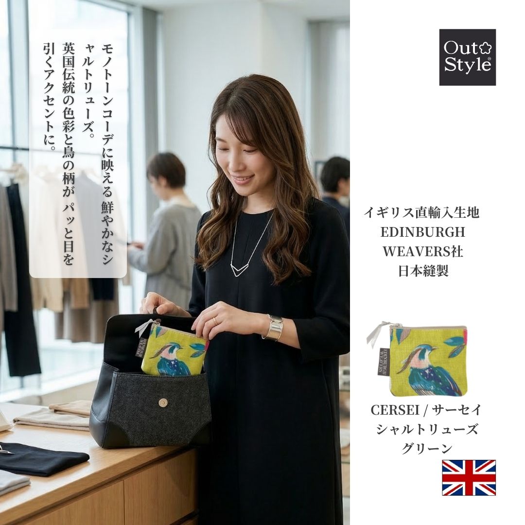 【Out Style公式】本来なら廃棄されてしまうはずだった最高級の輸入インテリアファブリックのハギレから生まれた、特別なミニポーチ。イギリス「EDINBURGH WEAVERS社」のリネンプリント生地を使用し、自社工場で丁寧に縫製した日本製です。「ポーチ・イン・ポーチ」でバッグの中を美しく整理できる、地球に優しいサステナブルなアイテムです。