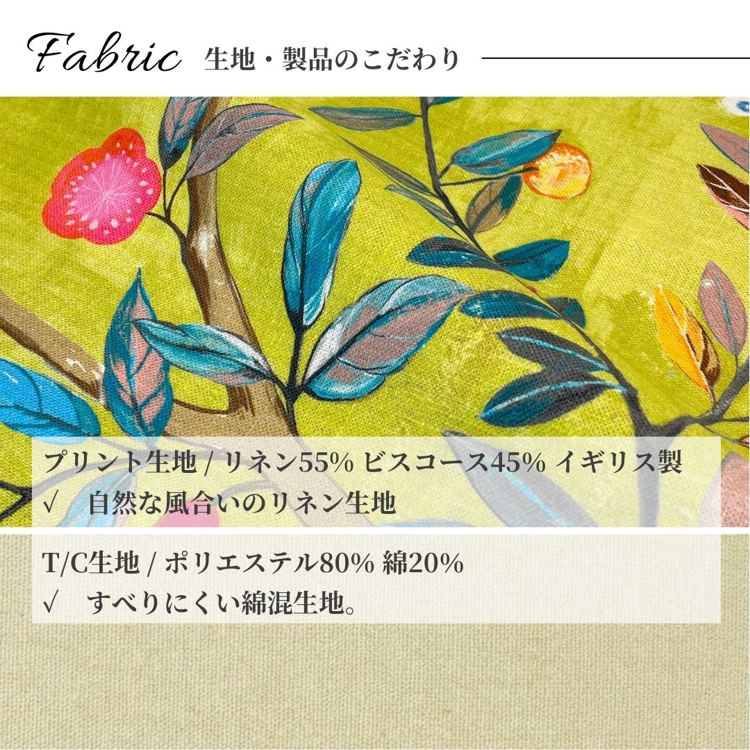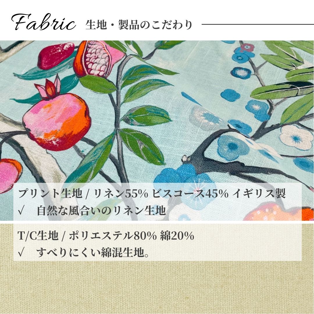 イギリスの歴史あるテキスタイルブランド EDINBURGH WEAVERS社のリネンプリント生地を贅沢に使用しています。クジャク、梅、ザクロといったイングリッシュガーデンを彷彿とさせる自然のエッセンスが、品位と上品さを添えます。
