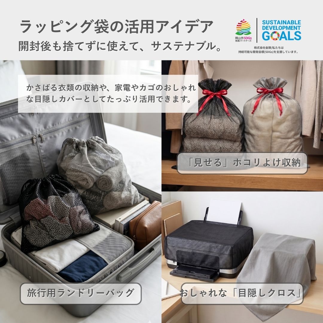 ・旅行時の「ちょっと贅沢なランドリーバッグ」:着用済みの衣類を入れる袋として。通気性が良く、キャリーケース内でも上質な雰囲気を保てます。