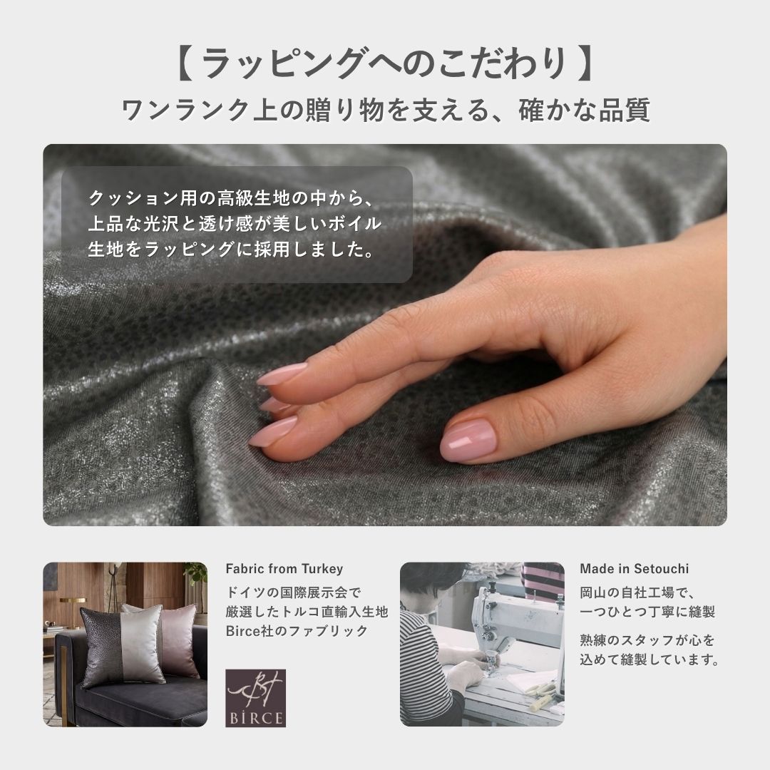 クッション用の高級生地の中から、上品な光沢と透け感が美しいボイル生地をラッピングに採用しました。ドイツの国際展示会で自ら厳選した、トルコ・Birce社のファブリックを使用しています。