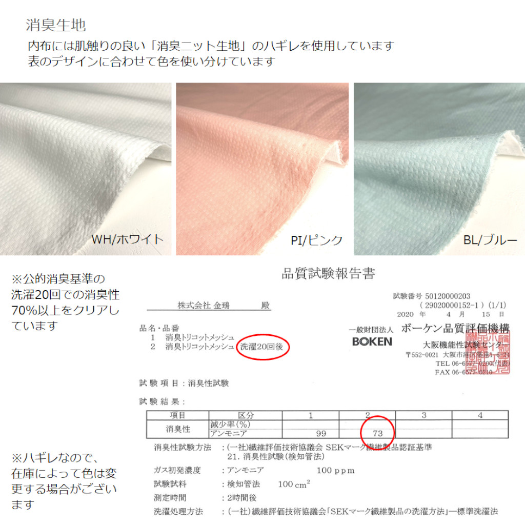 アンモニア消臭効果のある繊維で、汗の臭いが気になりにくい、20回洗っても消臭機能を保つ品質検査に合格しています。