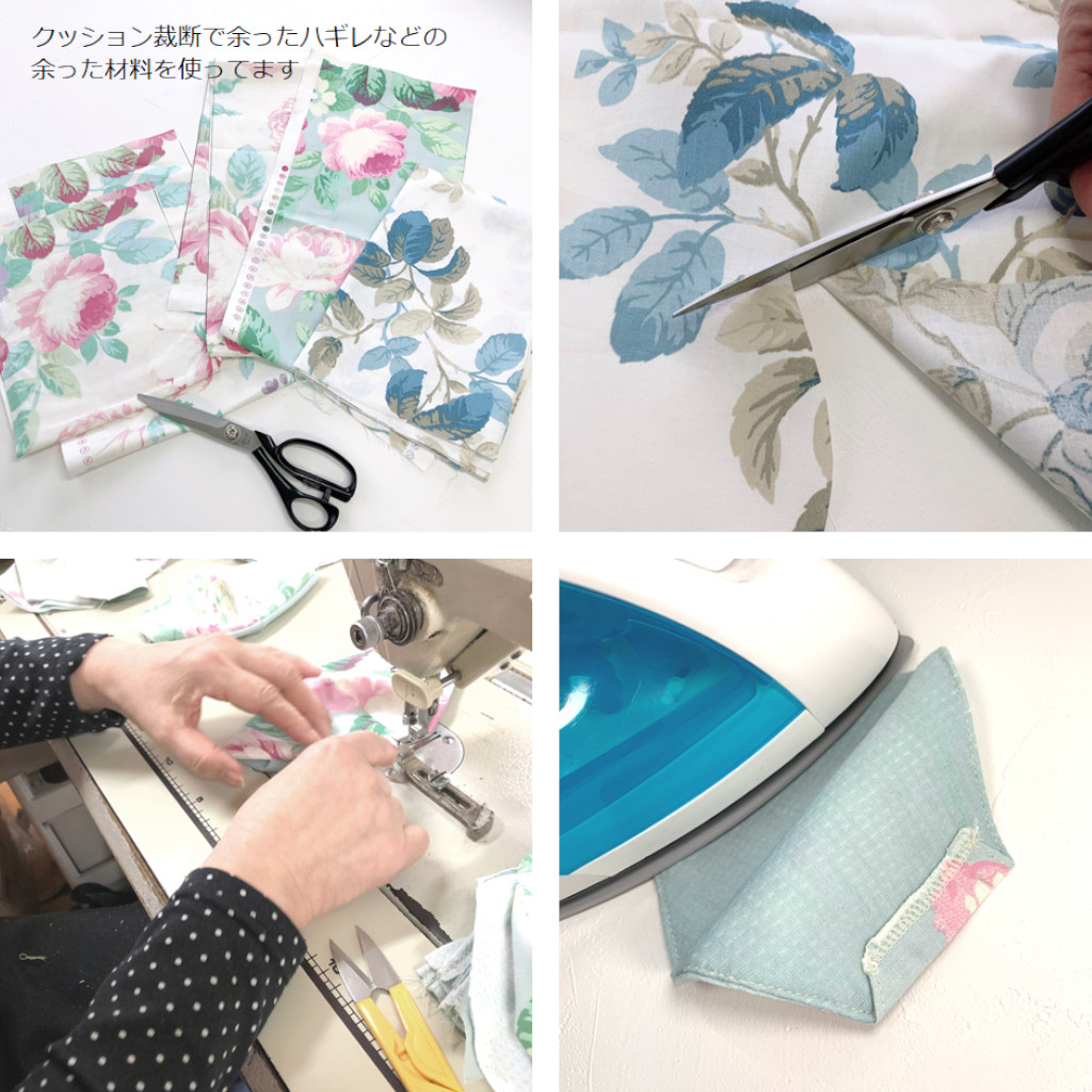 生地は、今工場にあるハギレを手で裁断しています。すべてが1品もので柄は全て異なります。