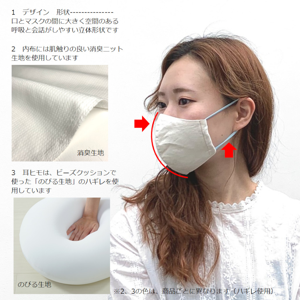 クッション専門工場が、クッション裁断で余ったハギレなどの余った材料を使って、手間と工夫で作ったマスクです。