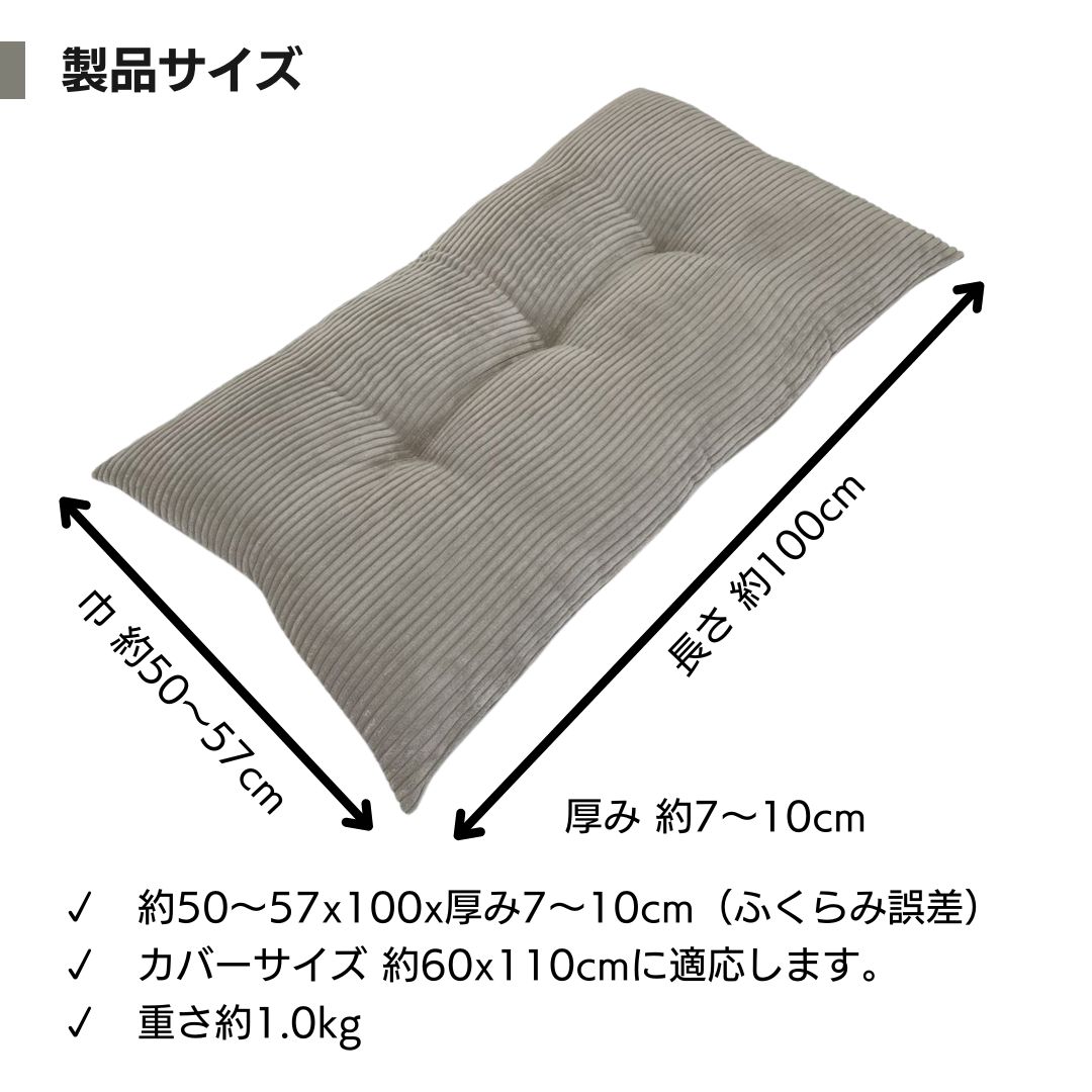 ・「わた」が入った製品サイズ/巾50~55×長さ100×厚み7~10cm(側地サイズ/60×110cm)