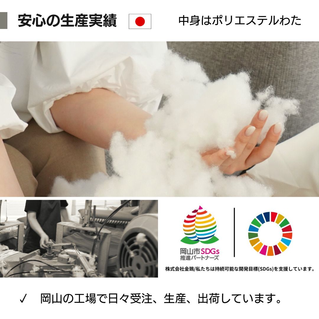・中身 ポリエステルわた100%(海外製)、中詰め加工/日本製。岡山の自社工場で中詰め製造しています。総重量/約1.0kg