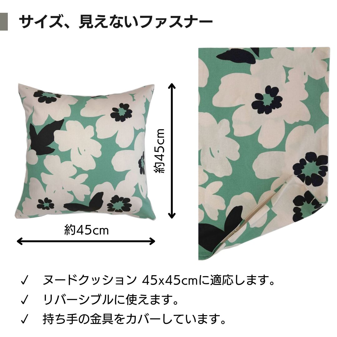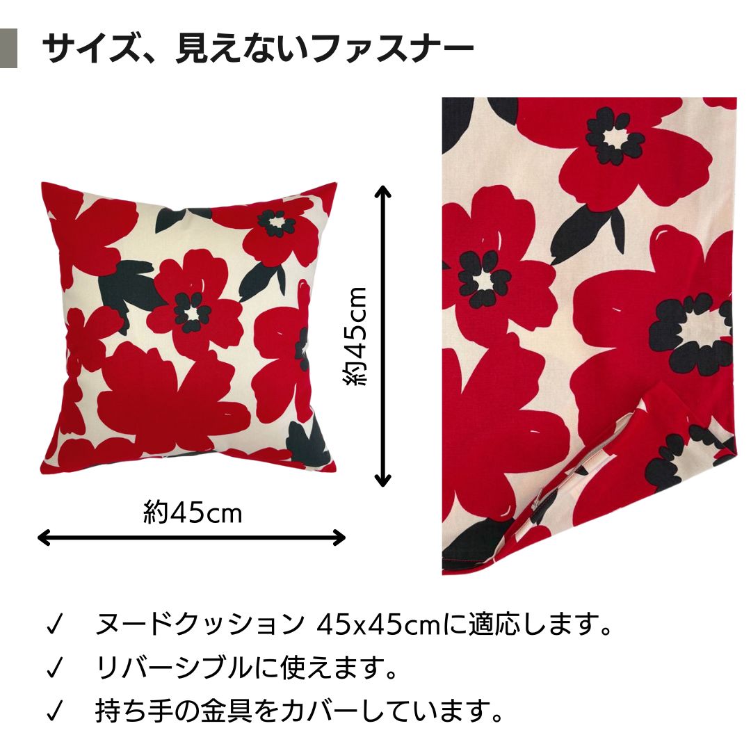 日本製の綿プリント生地で作った、ヌードクッション45x45cm用のクッションカバーです。