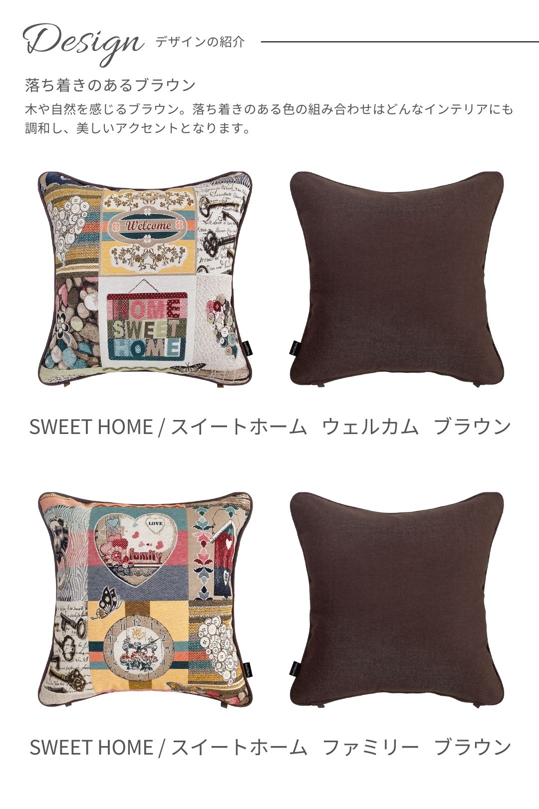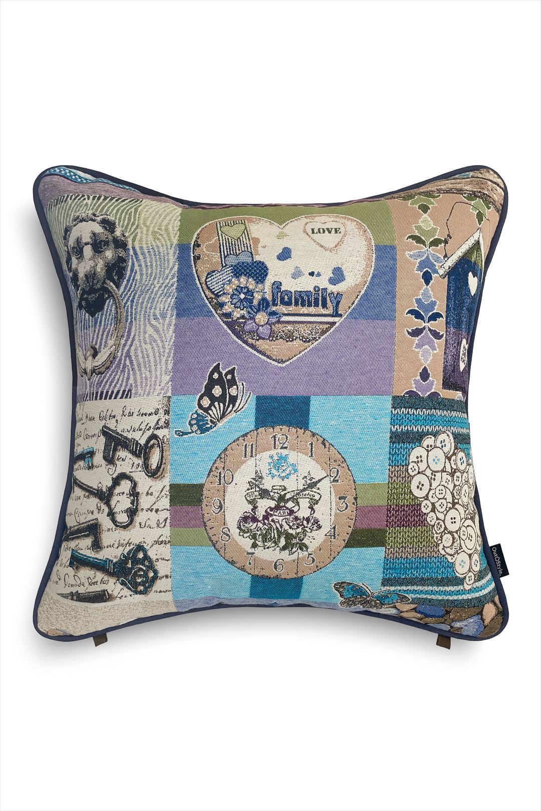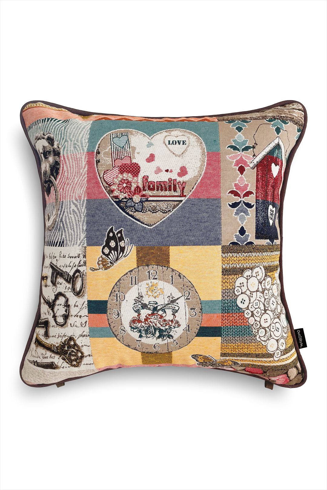 ゴブラン織を使用したクッションカバー。時計、鳥小屋、ボタンなどのモチーフが織り込まれ、心温まるアットホームな雰囲気を演出します。