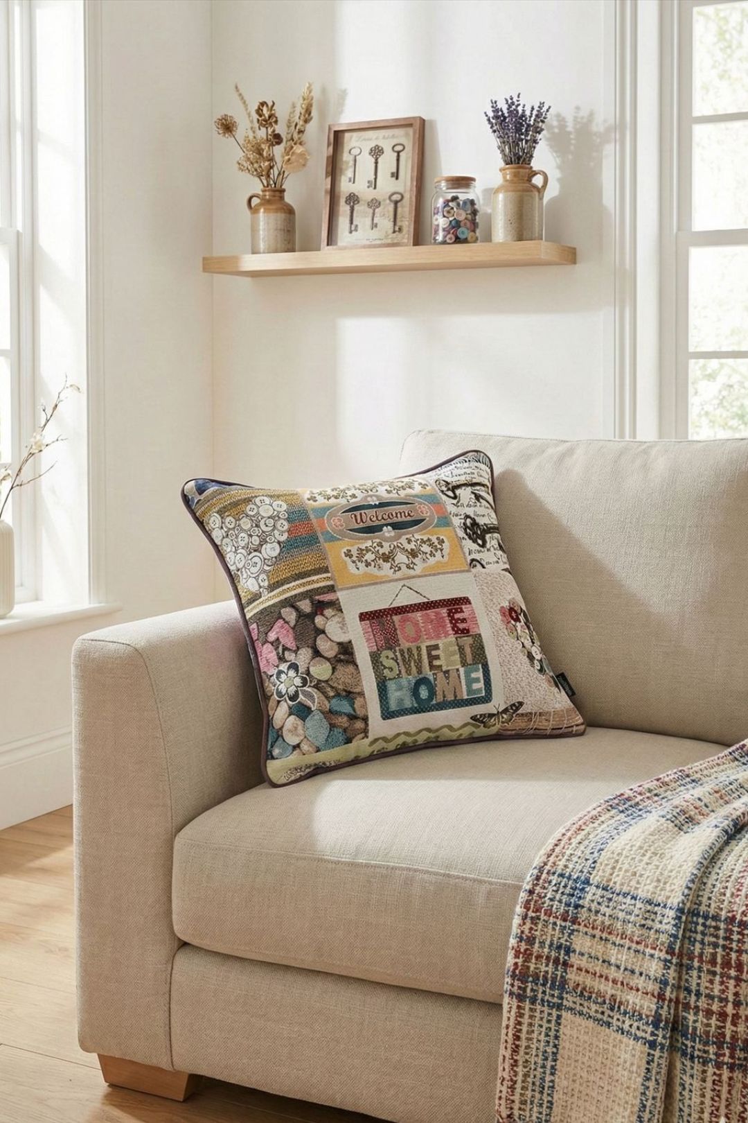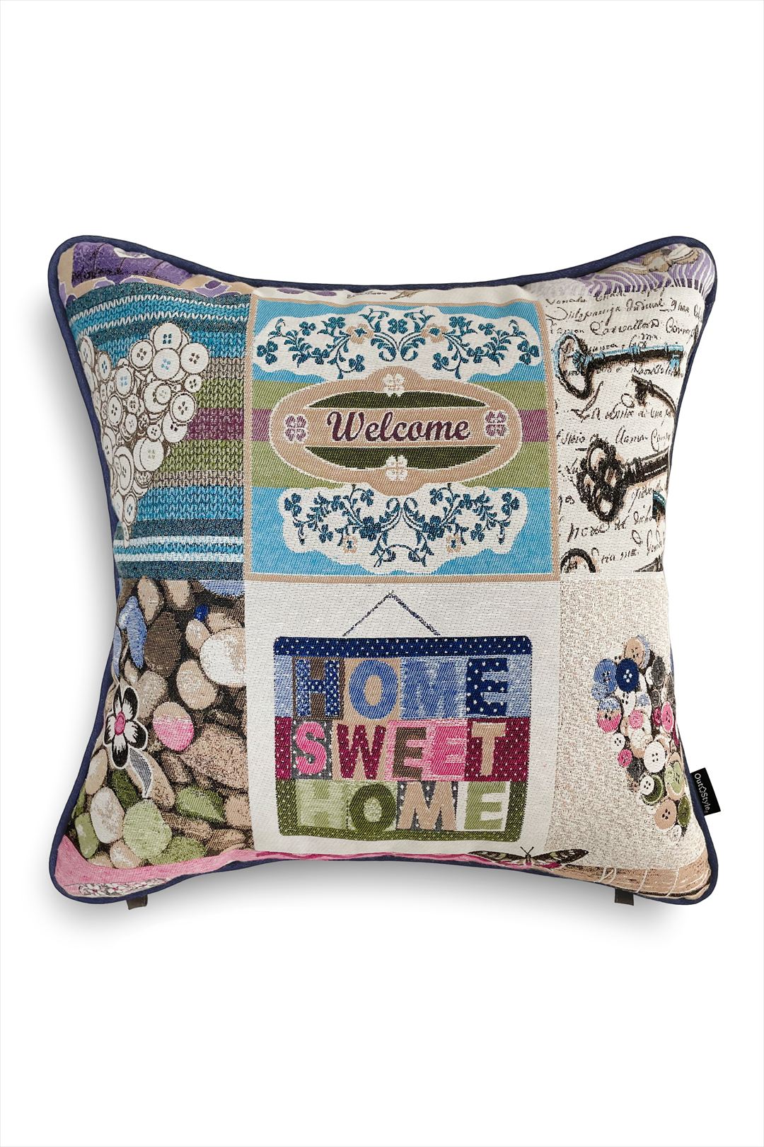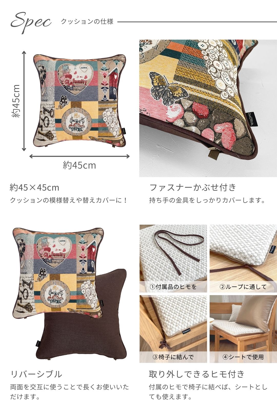 ゴブラン織を使用したクッションカバー。時計、鳥小屋、ボタンなどのモチーフが織り込まれ、心温まるアットホームな雰囲気を演出します。