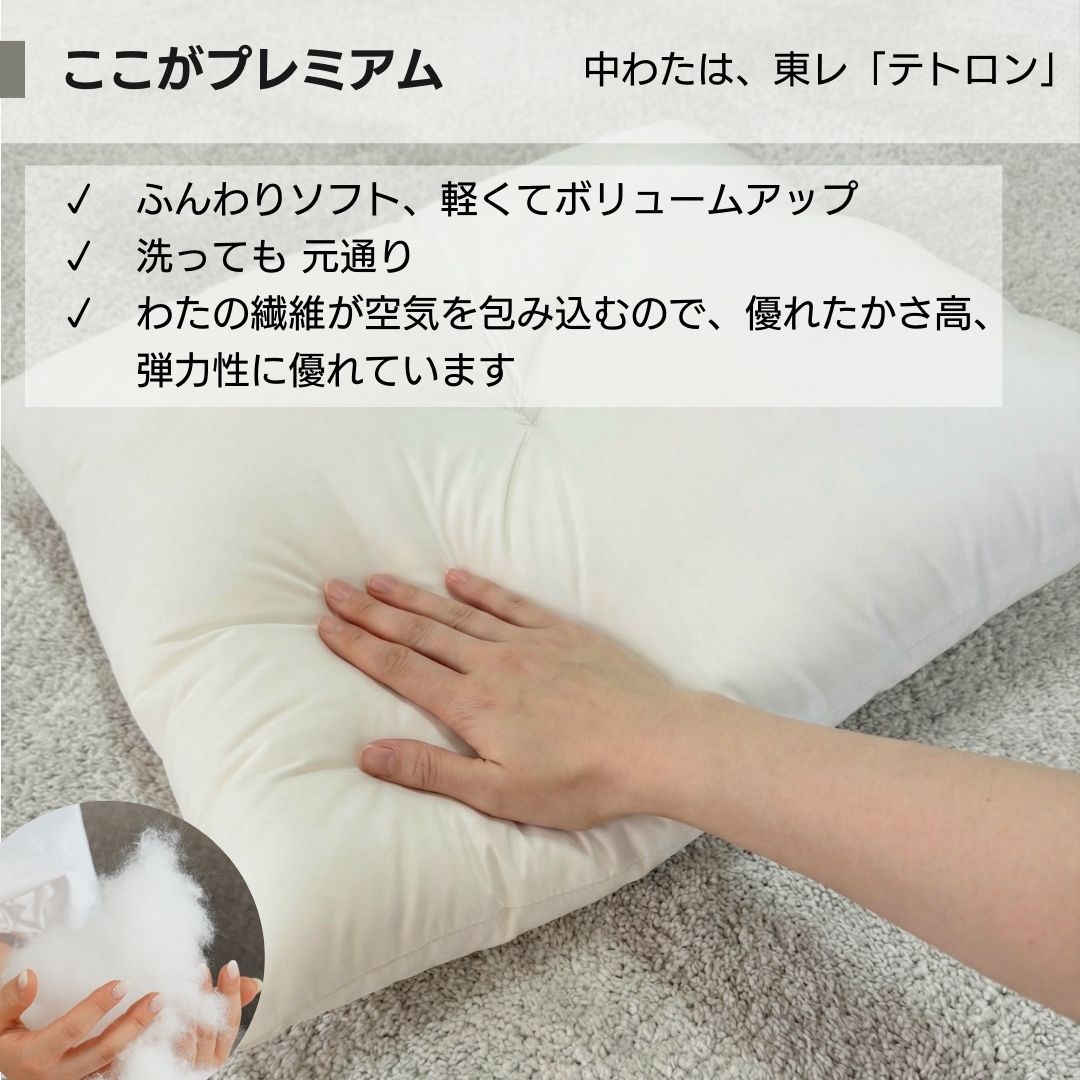国産の洗える「ポリエステルわた」国内メーカー東レ「テトロン」を使用。丸洗いした後も高い復元率。