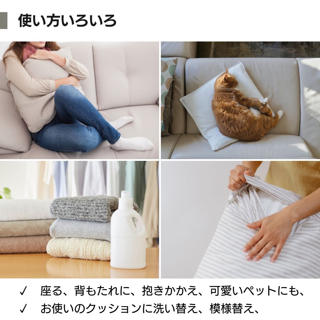 3. 汚れても安心、ご自宅で洗えます 毎日使うものだから、清潔さは大切。ファスナー仕様で簡単に取り外しができ、ご自宅の洗濯機で丸洗いが可能です(※洗濯ネットをご使用ください)。小さなお子様やペットのいるご家庭でも安心してお使いいただけます。