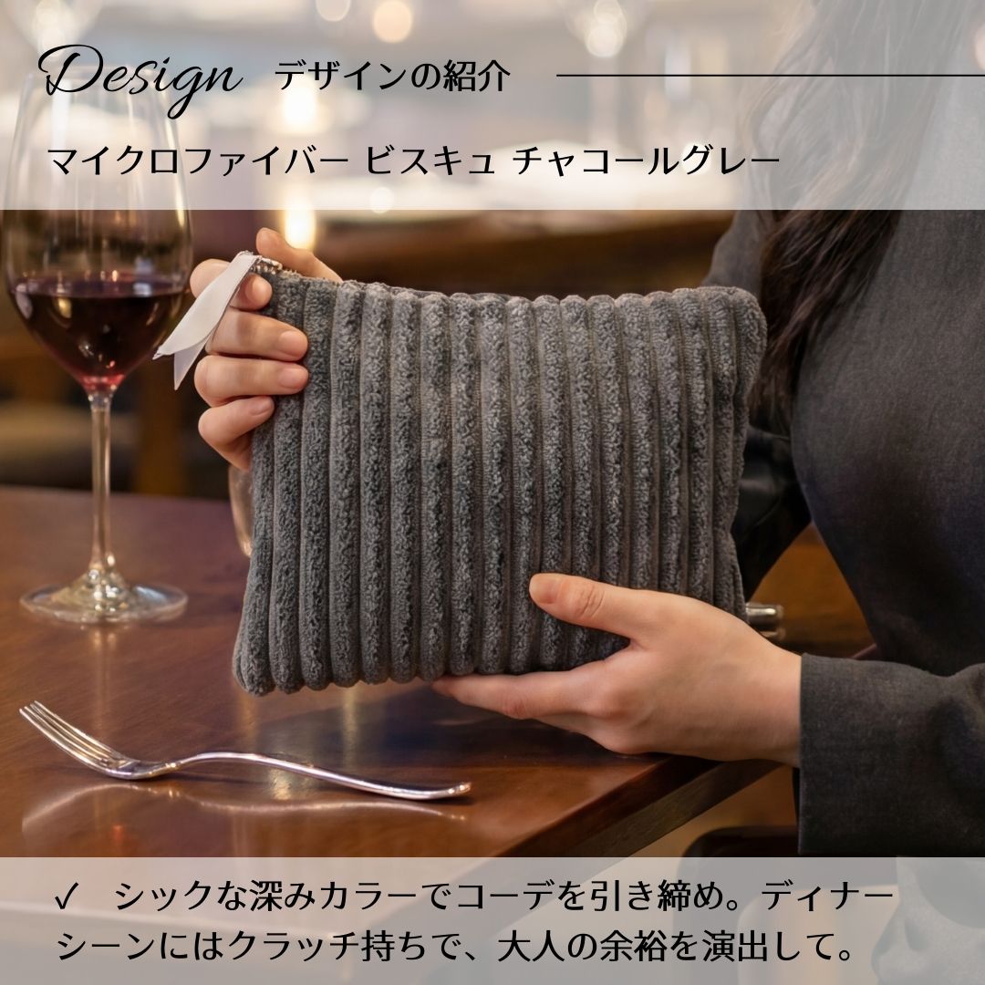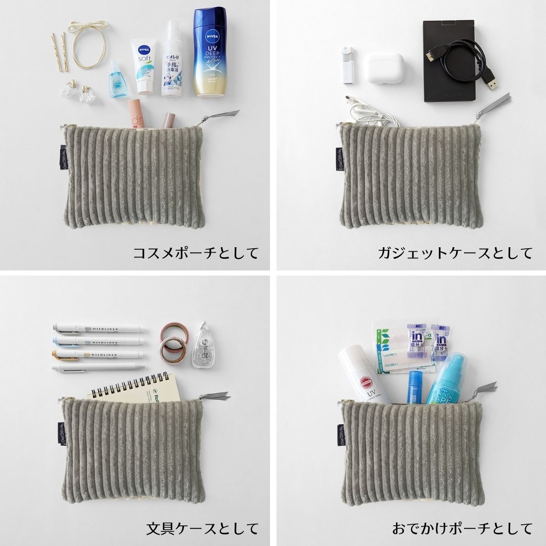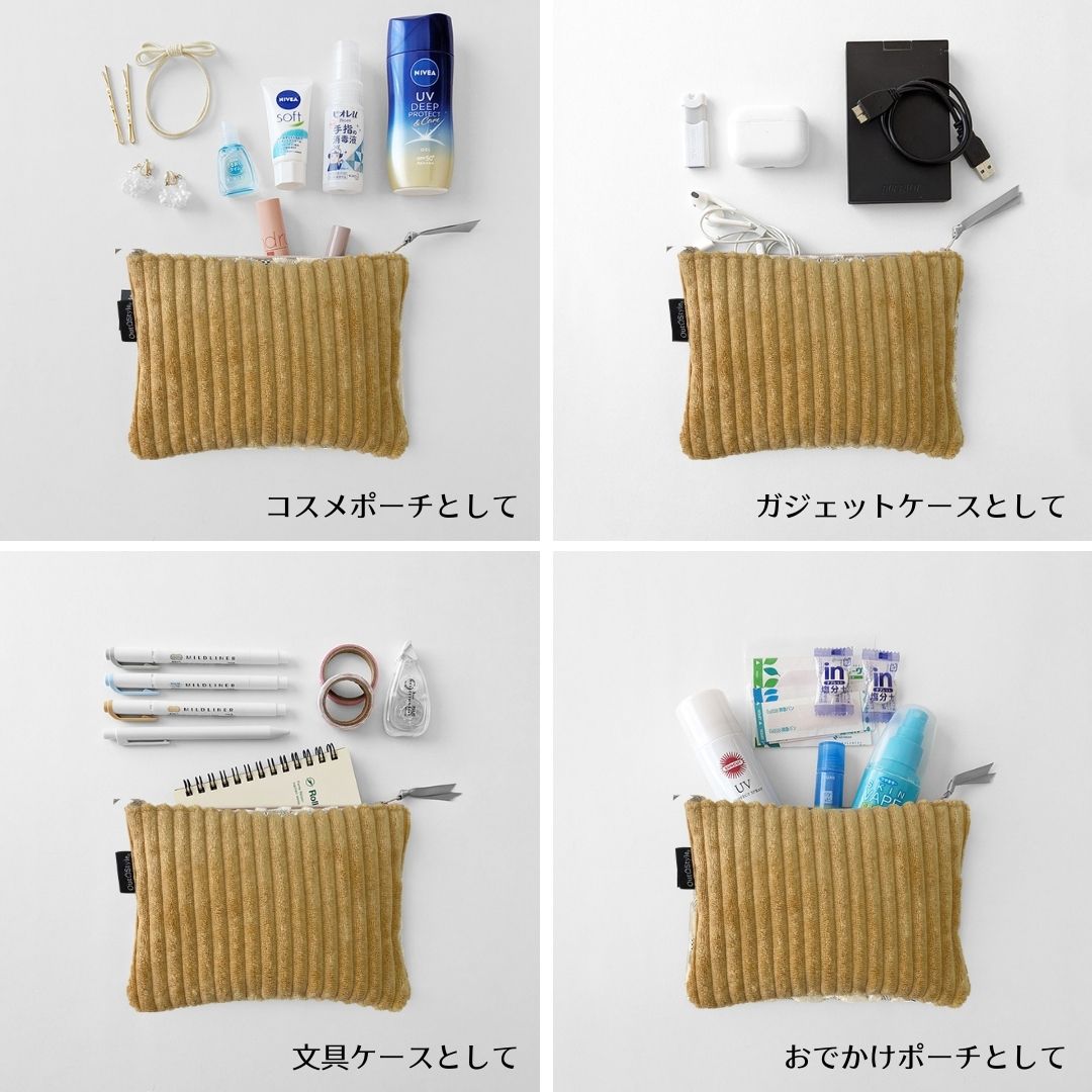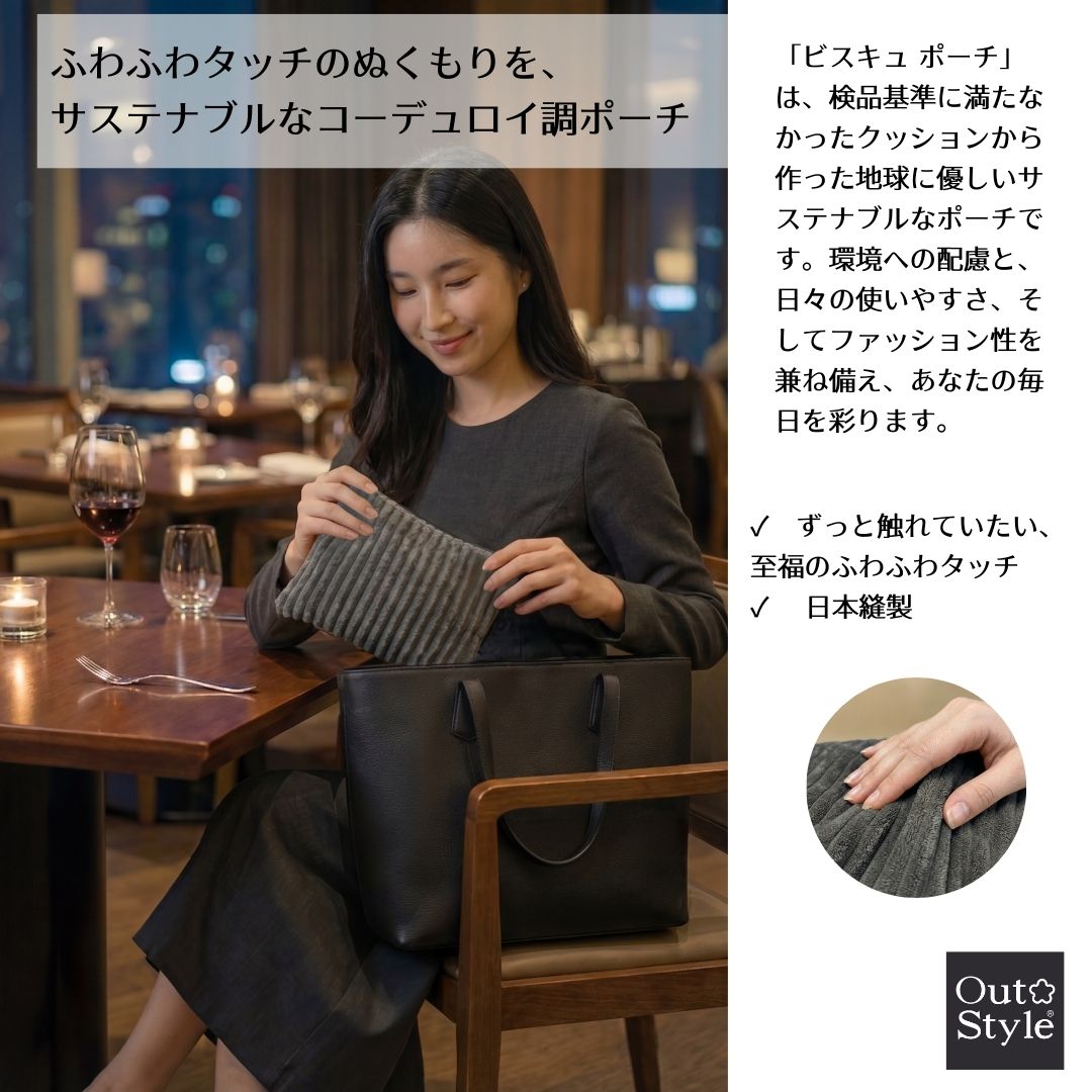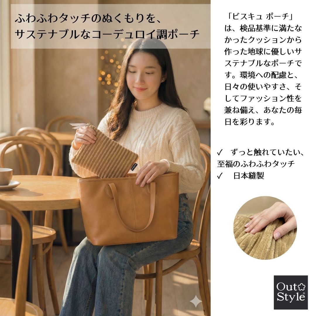 秋冬の装いに、やさしい温かみを添えるアイテムが届きました。 老舗クッションメーカーが手掛ける、触れるたびに癒されるコーデュロイ調ポーチ。 素材へのこだわりと、地球への思いやりが詰まった一品です。