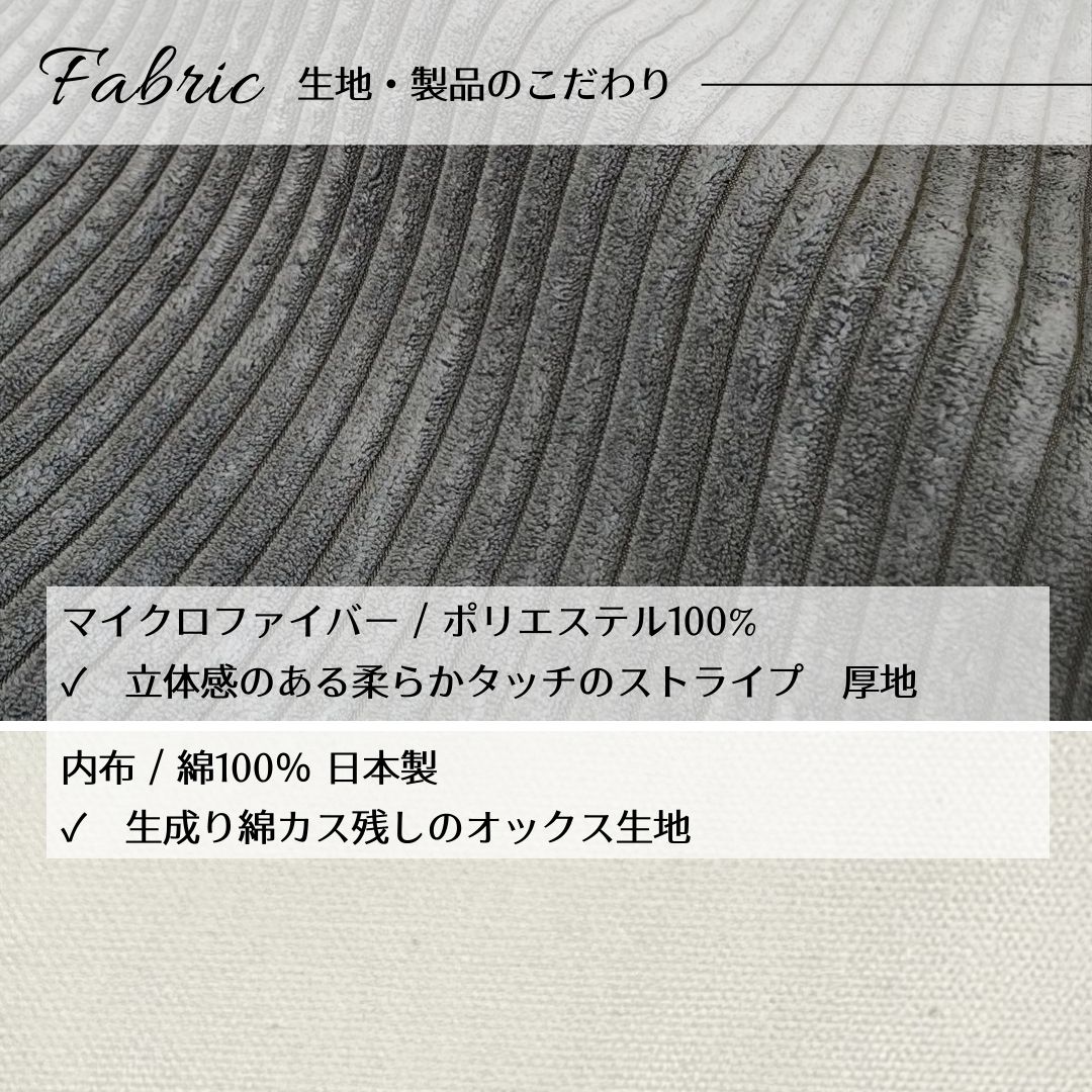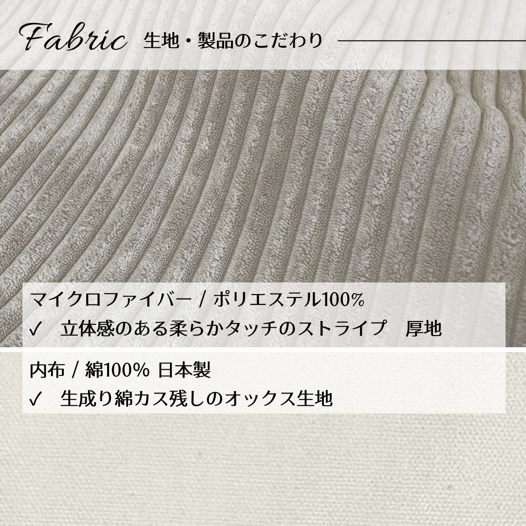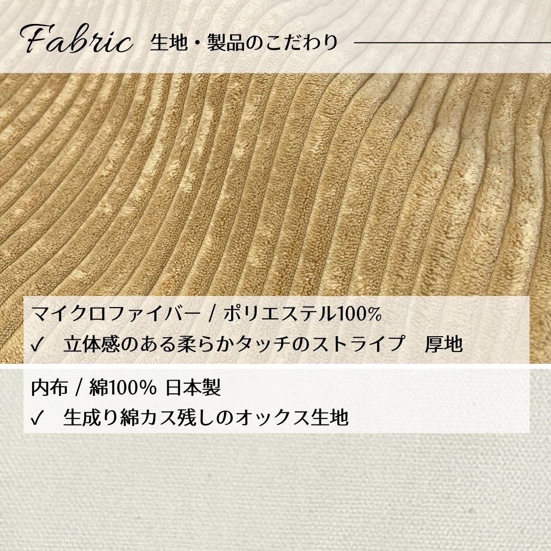 ■ ずっと触れていたい、至福のふわふわタッチ 表地には、まるで焼きたてのビスケットのように温かみのある、コーデュロイ調マイクロファイバー生地を使用。思わず頬ずりしたくなるような、ふんわりと柔らかく、なめらかな肌触りが特徴です。