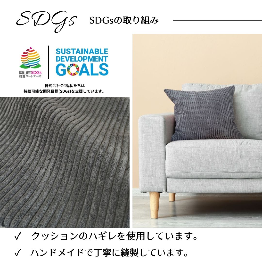 「ビスキュ ポーチ」は、老舗クッションメーカー「金鵄(きんし)」のサステナブルな取り組みから生まれました。 中国工場で縫製されたクッションは、日本国内で厳しい検品が行われます。その過程で、小さなキズや汚れのために惜しくも規格外となってしまったクッションたち。 それらを廃棄するのではなく、まだ使えるきれいな生地部分を丁寧に裁断し、新たな命を吹き込んでポーチとして蘇らせました。 使う人にも、地球にもやさしい、アップサイクルなアイテムです。
