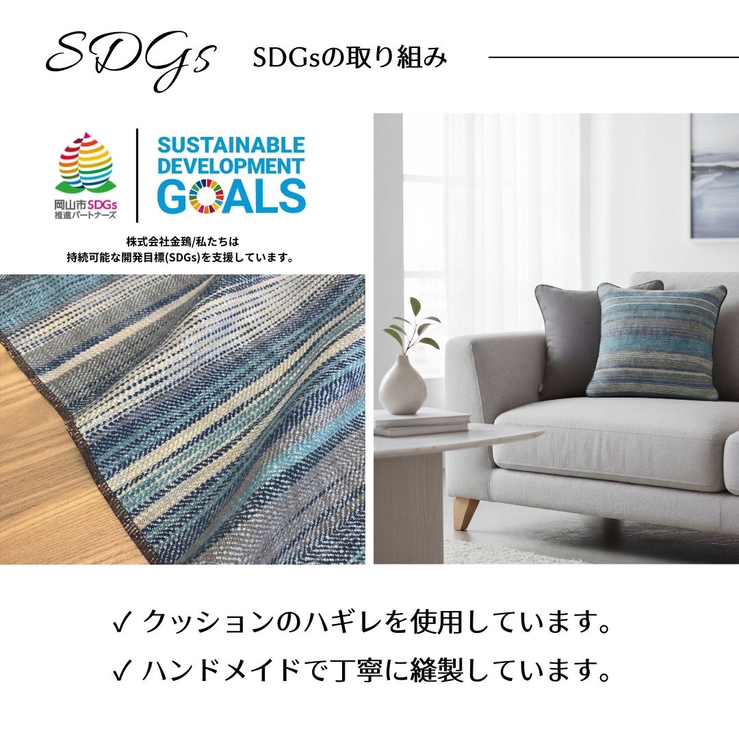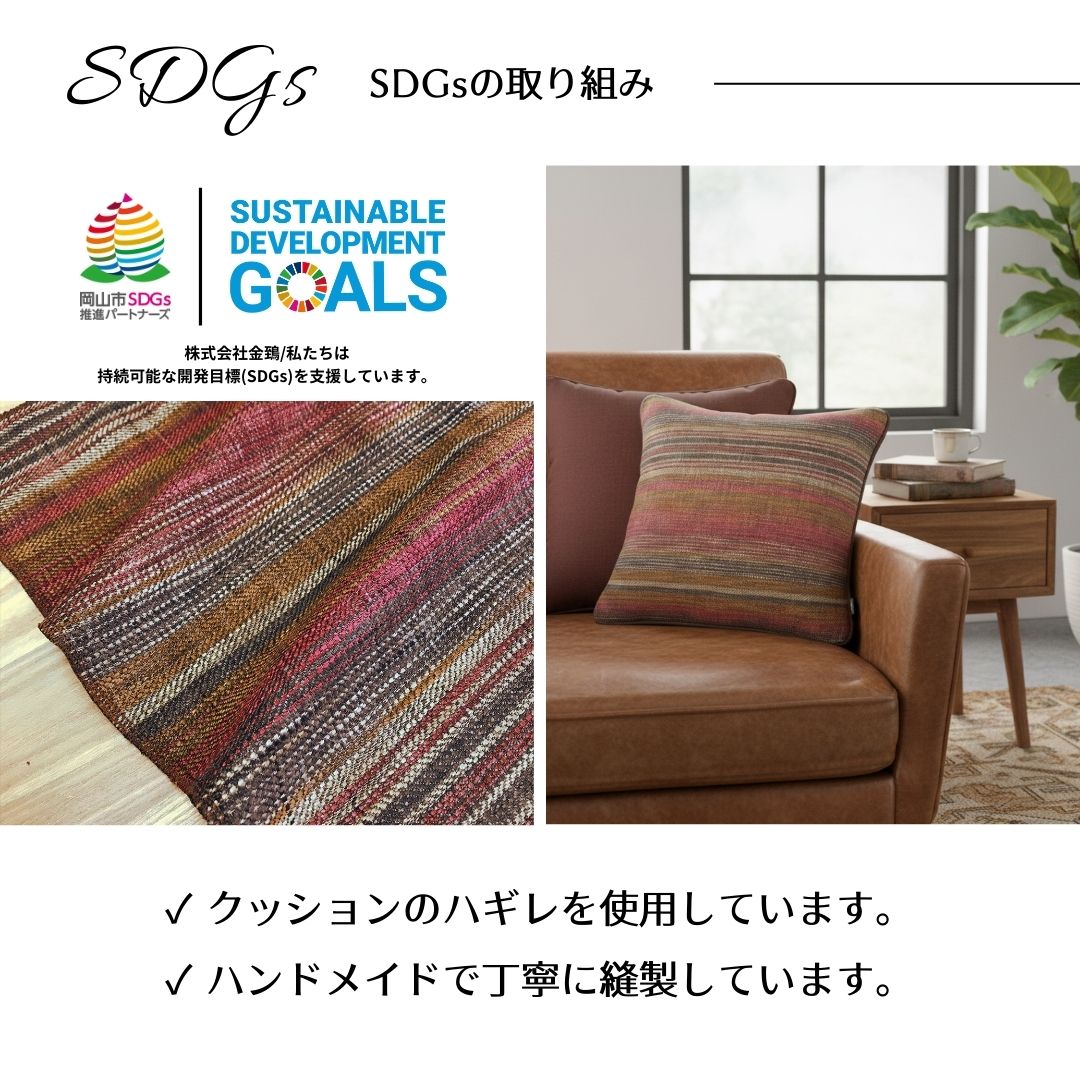 クッションメーカー「金鵄(きんし)」の取り組み: クッション製造の過程でどうしても発生してしまうハギレ。本来なら廃棄されてしまうその貴重な生地を、国内の自社工場で丁寧に裁断・縫製し、ポーチとして生まれ変わらせました。