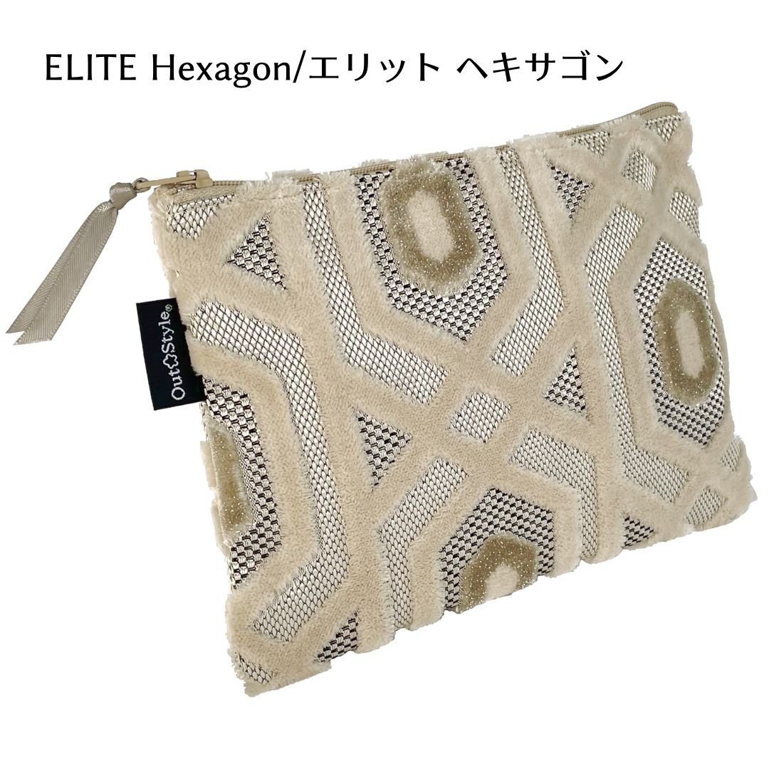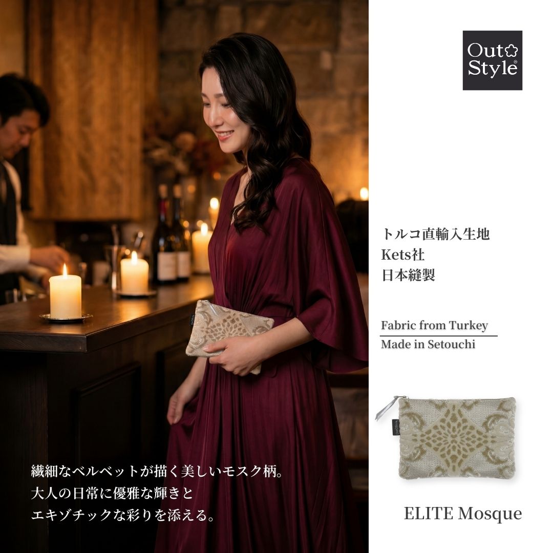 【Out Style公式】トルコ「KETS社」の高級ベルベットジャガード生地を使用した「エリット」ポーチ。ドット、ヘキサゴン、モスクの美しい3柄展開。ハギレを活かしたサステナブルな日本製アイテムです。大人の日常をクラスアップさせる上品な小物入れ。