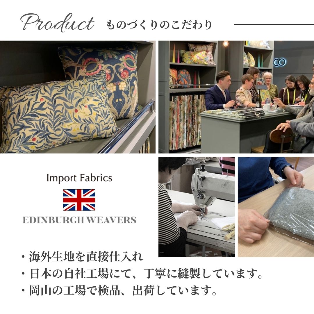 イギリスの歴史あるテキスタイルブランド EDINBURGH WEAVERS社のリネンプリント生地を贅沢に使用しています。クジャク、梅、ザクロといったイングリッシュガーデンを彷彿とさせる自然のエッセンスが、品位と上品さを添えます。